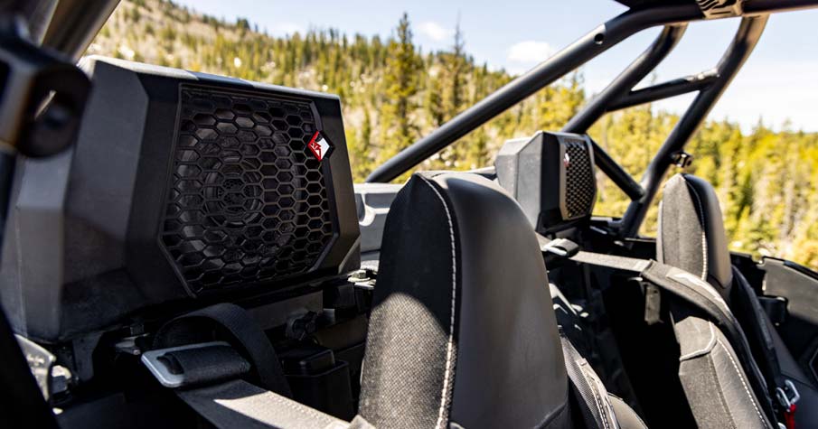 Factory-tuned and integrated Rockford Fosgate Stage 4 audio system with RIDE COMMAND source unit. Includes: (2) 100-W 1" tweeters, (2) 100-W 6.5" component front speakers, (2) 100-W 6.5" coaxial rear speakers, (1) 400-W 4-channel amplifier, and (1) 10" subwoofer with an integrated 400-W subwoofer amplifier. Audio system is IPX7- and IPX9K-water immersion tested to withstand the wet elements.