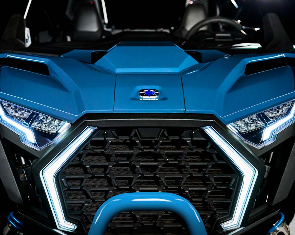 Signature animated RZR Fang Accent Lighting; white LED low/high and red LED tail/brake lights; animated interior accent lighting.